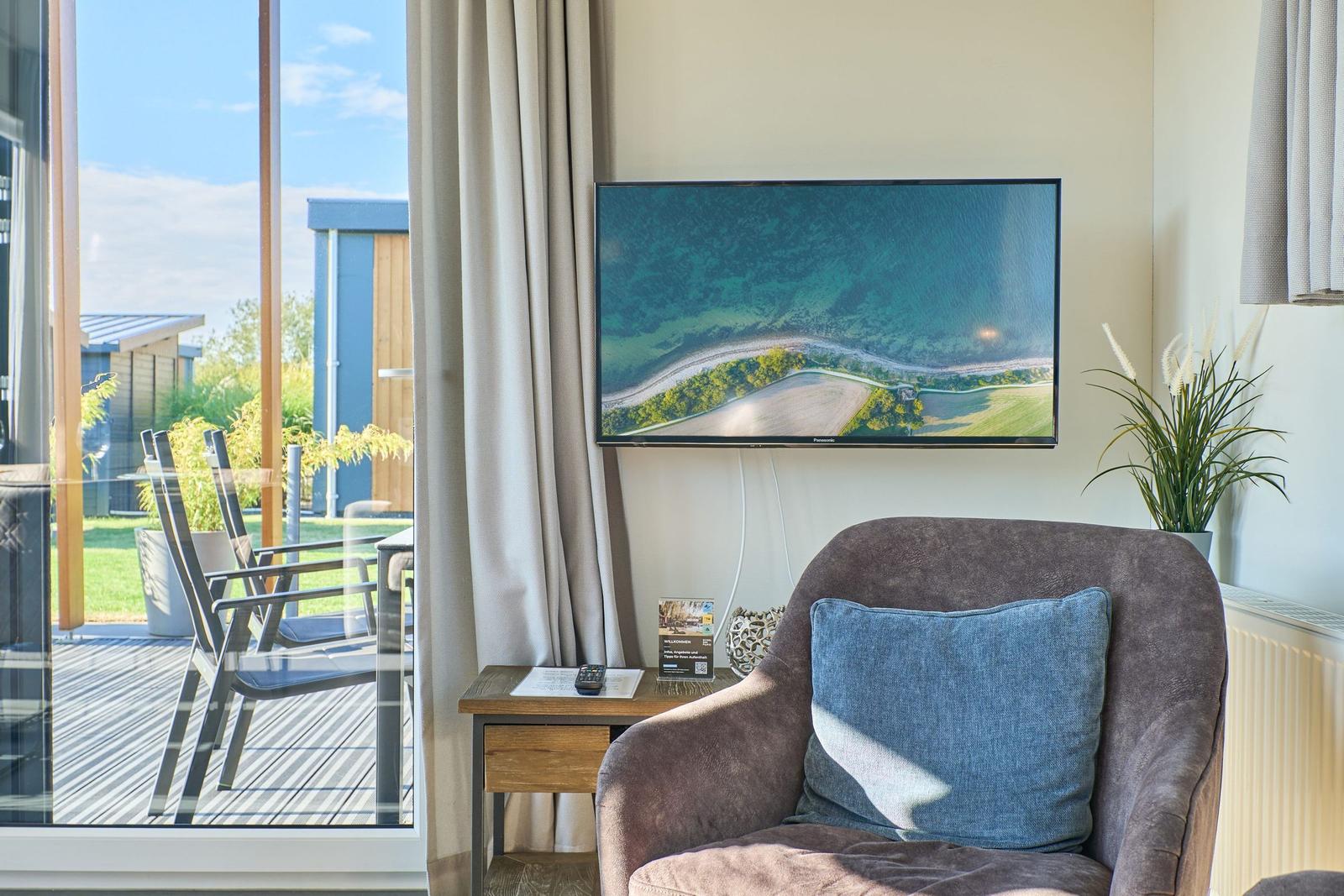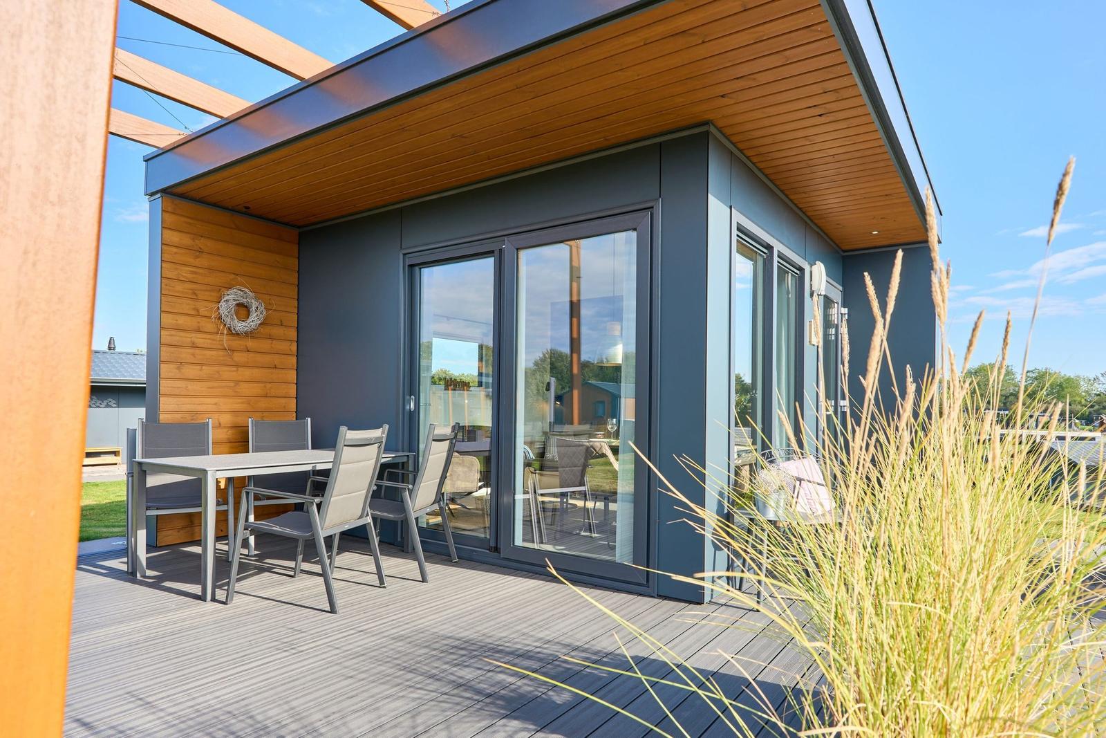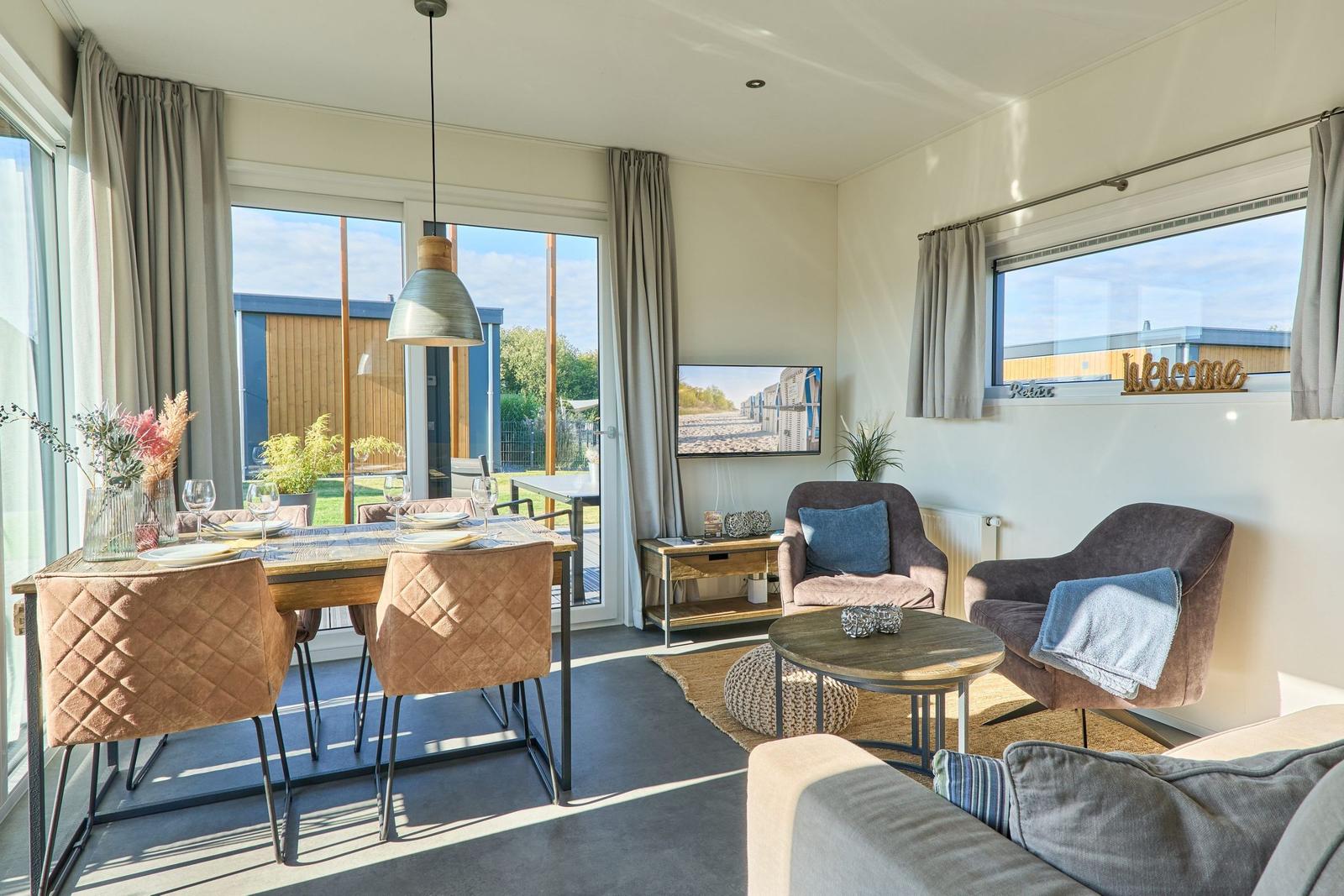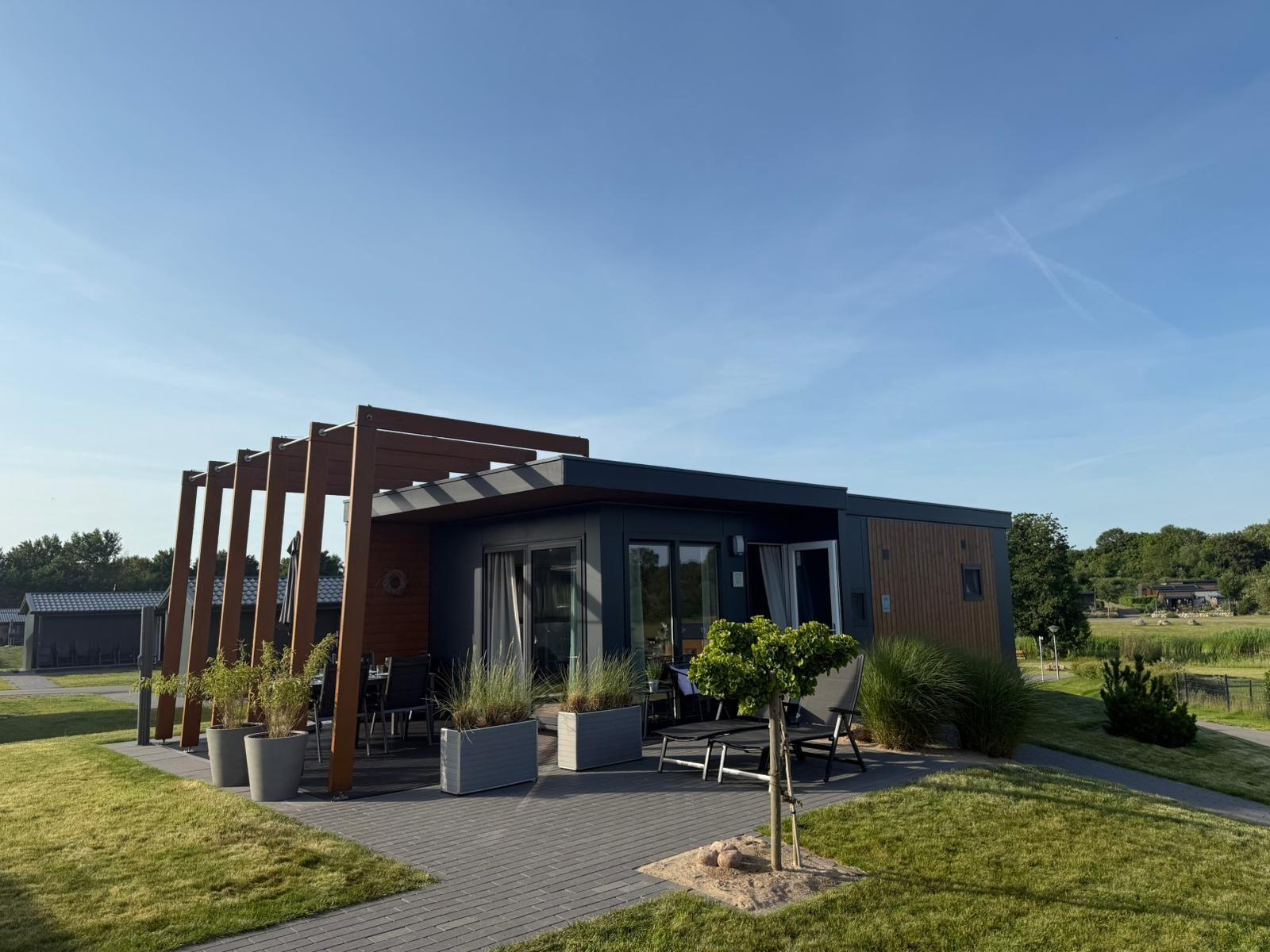Das Chalet Relax-Inn in der Ferienanlage Seeparx Süsel bietet auf 40 m² modernen Komfort für bis zu vier Personen. Die offene Küche, harmonisch ins Wohnzimmer integriert, ist umfassend ausgestattet und verfügt über eine Spülmaschine, einen Gasbackofen sowie weitere Geräte wie Kühlschrank mit Gefrierfach, Wasserkocher, Toaster, Kaffeemaschine und Mikrowelle. Zwei separate Schlafzimmer mit Vinylbodenbelag garantieren einen erholsamen Schlaf. Das Tageslichtbadezimmer ist mit bodengleicher Dusche, WC, Waschbecken und Handtüchern ausgestattet. Für zusätzlichen Komfort sorgen Klimaanlage, WLAN und ein Flachbildfernseher. Gemeinschaftlich nutzbar sind Waschmaschine und Trockner, die sich im Haus befinden. Eine möblierte Terrasse lädt zum Entspannen ein. Bettwäsche ist inklusive, und ein kostenloser Parkplatz sowie eine Ladestation für Elektroautos sind vorhanden. Das Chalet ist ein Nichtraucherhaus und eignet sich hervorragend für Familien sowie aktive Gäste.
