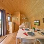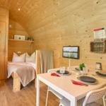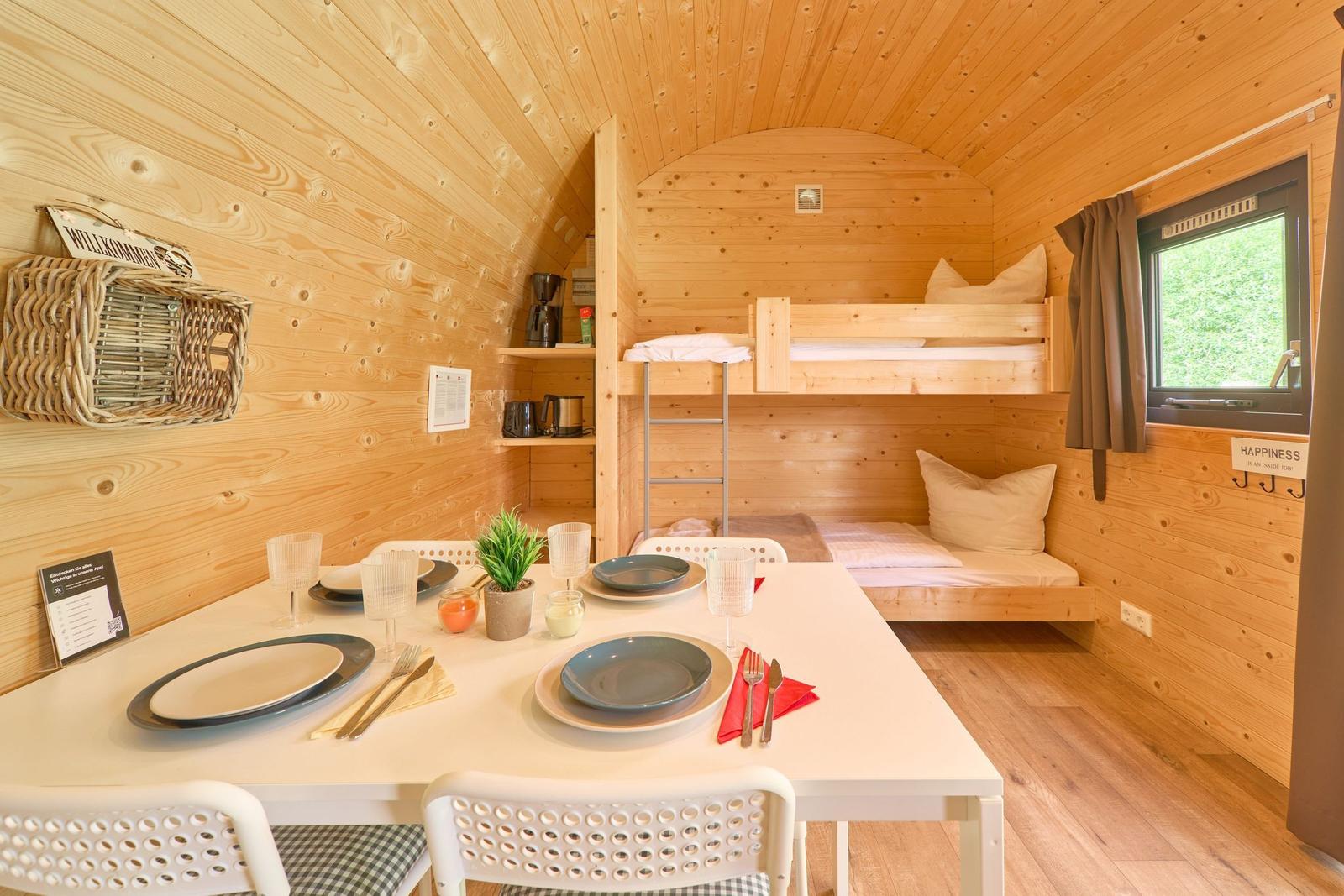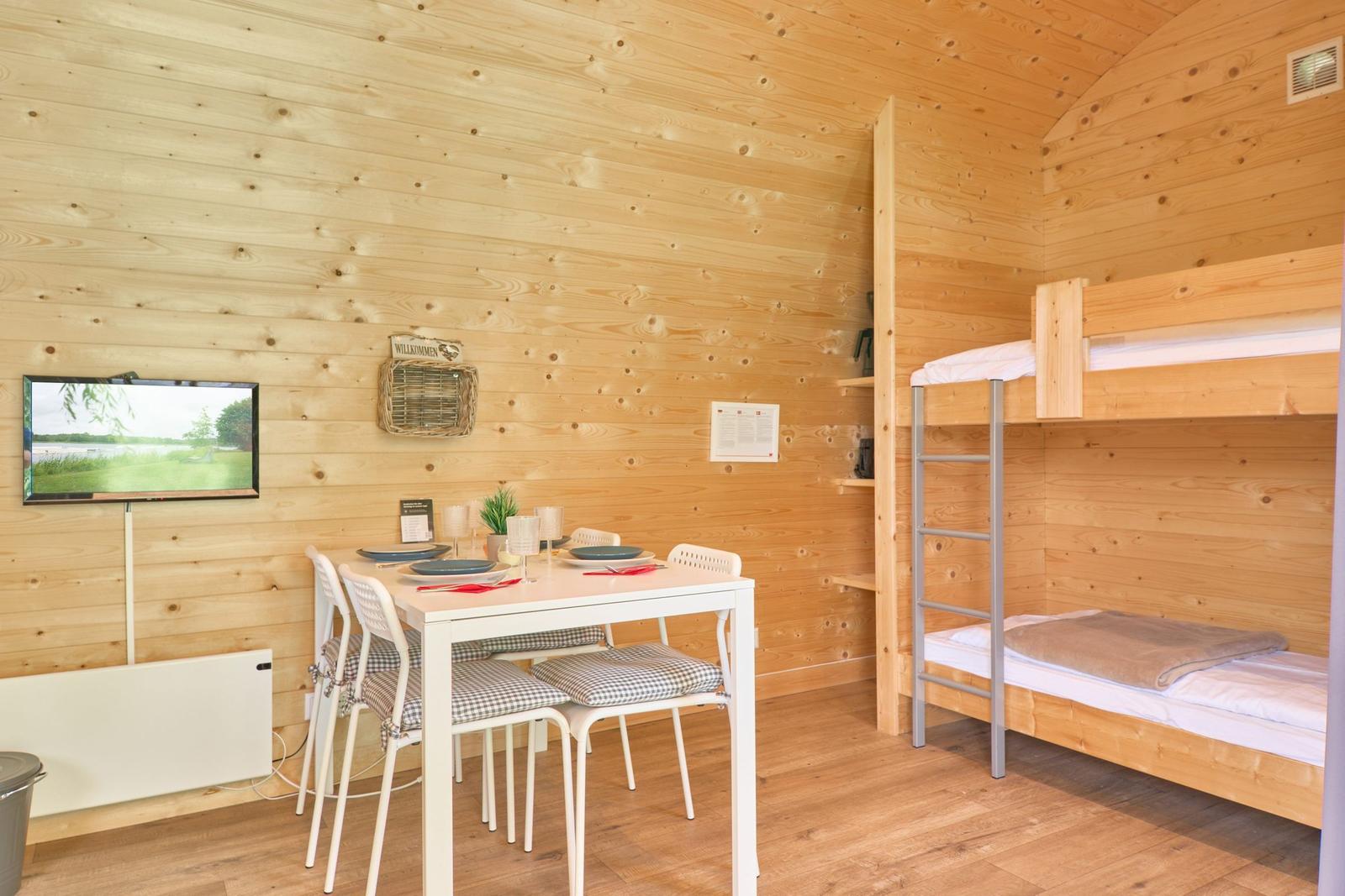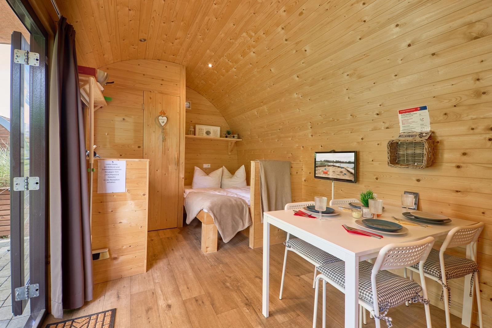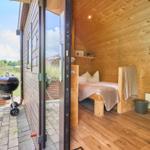 Das Vermittlungsportal präsentiert die Ferienlodge Boarder's Heaven im Süsel Seeparx Camping Resort und hebt den attraktiven Außenbereich hervor. Jede Lodge bietet eine kleine, gepflasterte Terrasse mit einem Sonnensegel, die einen wunderbaren Blick auf den See ermöglicht und ideal zum Entspannen ist. Umgeben von einer großen Rasenfläche, lädt das Gelände zu Spaziergängen und zur Erholung in der Natur ein. Gemeinschaftliche Duschen sind im Resort verfügbar. Ein Spielplatz für Kinder sorgt für zusätzlichen Spaß im Freien. Morgens gibt es die Möglichkeit, frische Brötchen an der Rezeption vorzubestellen. Die Lage des Resorts ermöglicht Aktivitäten wie Wandern, Radfahren und Wassersport, was die Outdoor-Erlebnisse für die Gäste bereichert. Die lodges sind individuell und liebevoll eingerichtet, ideale Bedingungen für einen komfortablen Aufenthalt im Freien.