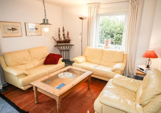 Drei Zimmer mit zwei separaten Schlafbereichen, Terrasse und Küche bietet Platz für vier Gäste. Bodentiefe Fenster im Wohnzimmer sorgen den ganzen Tag für eine helle und freundliche Atmosphäre. Von hier aus gelangt man auch auf die großzügige, möblierte Süd-Terrasse mit Blick in den Garten, welcher zur gemeinschaftlichen Nutzung zur Verfügung steht. Hinter dem Haus befindet sich ein abgeschlossener und überdachter Innenhof als Auslauf für Ihren Hund. Die offene Küche ist voll ausgestattet und lässt keine Wünsche offen. Ein Schlafzimmer ist mit einem bequemen Doppelbett (1,80er Breite) ausgestattet. Der zweite separate Schlafbereich verfügt über ein Bett mit Ausziehfunktion (1,80er Breite), sodass man es als Doppelbett nutzen kann.