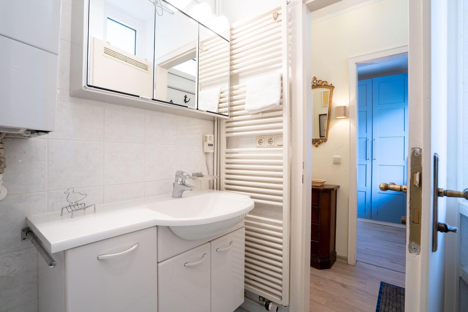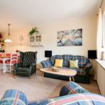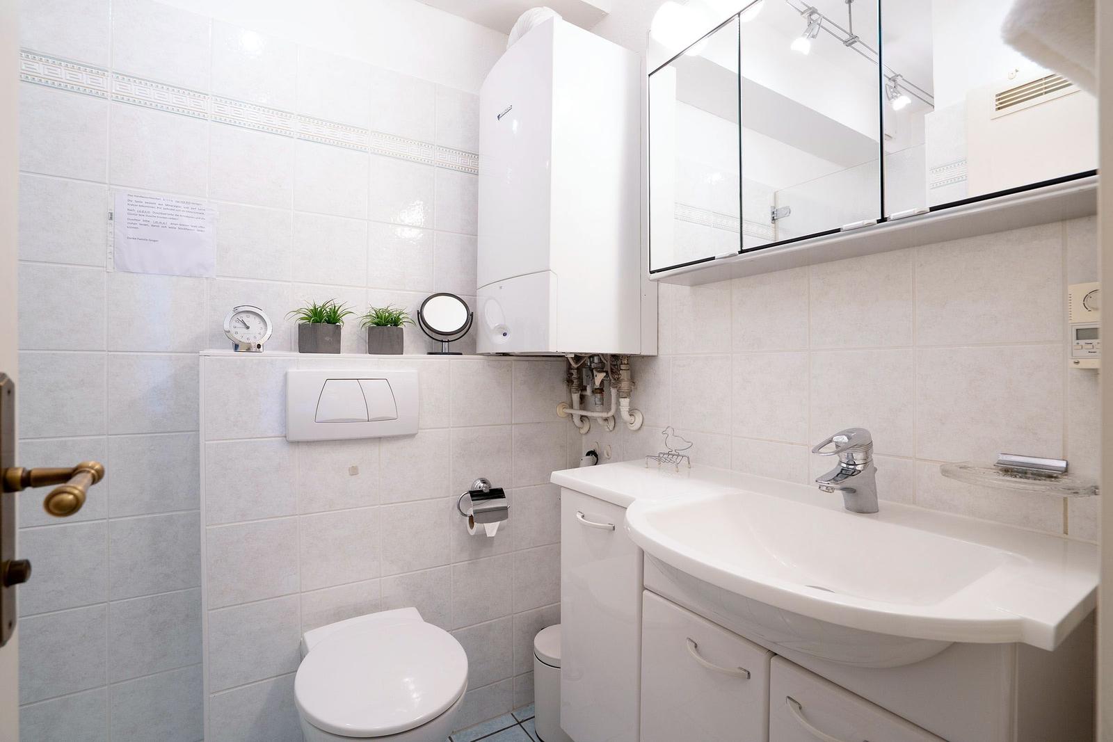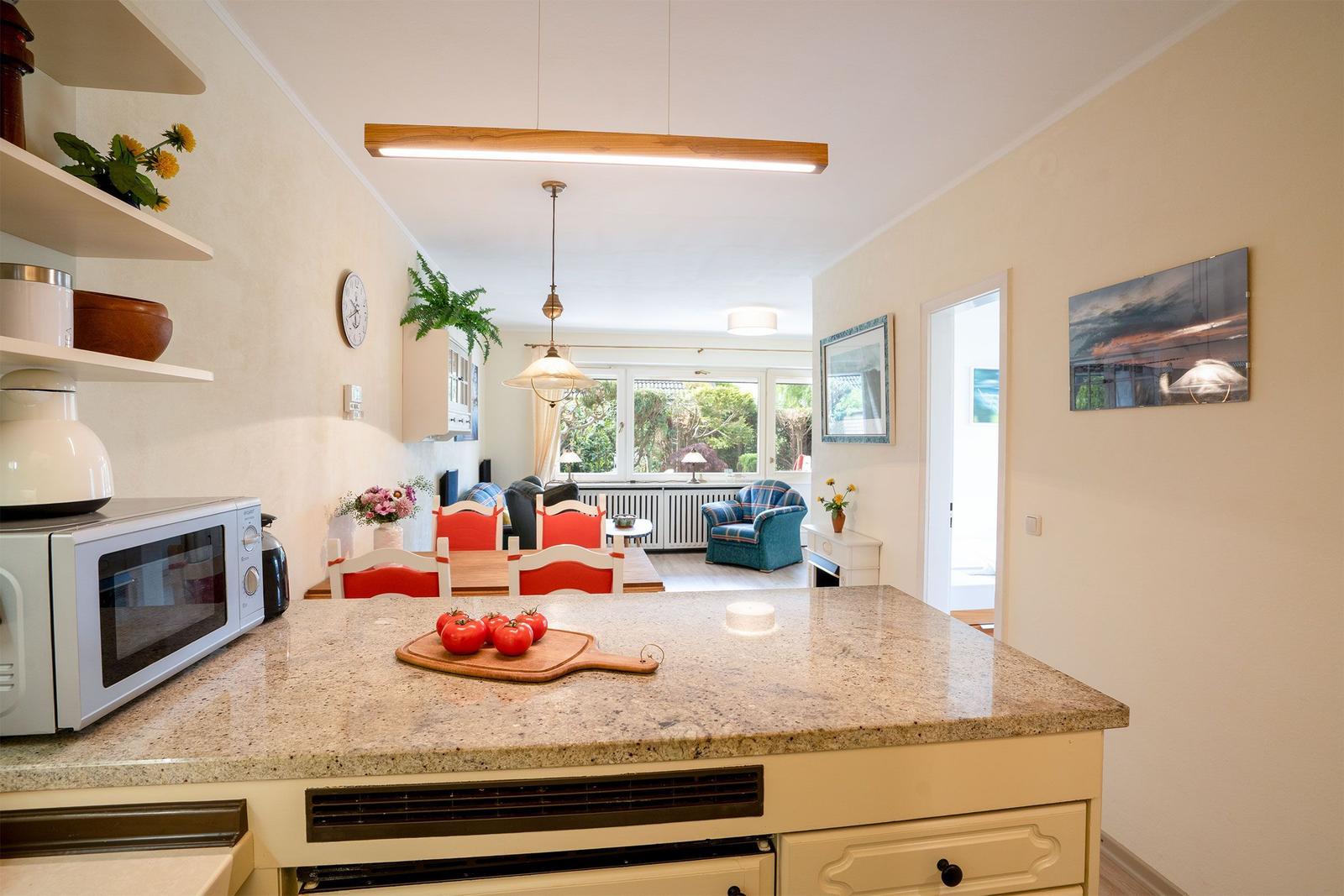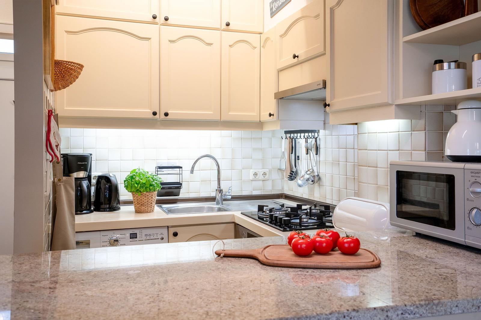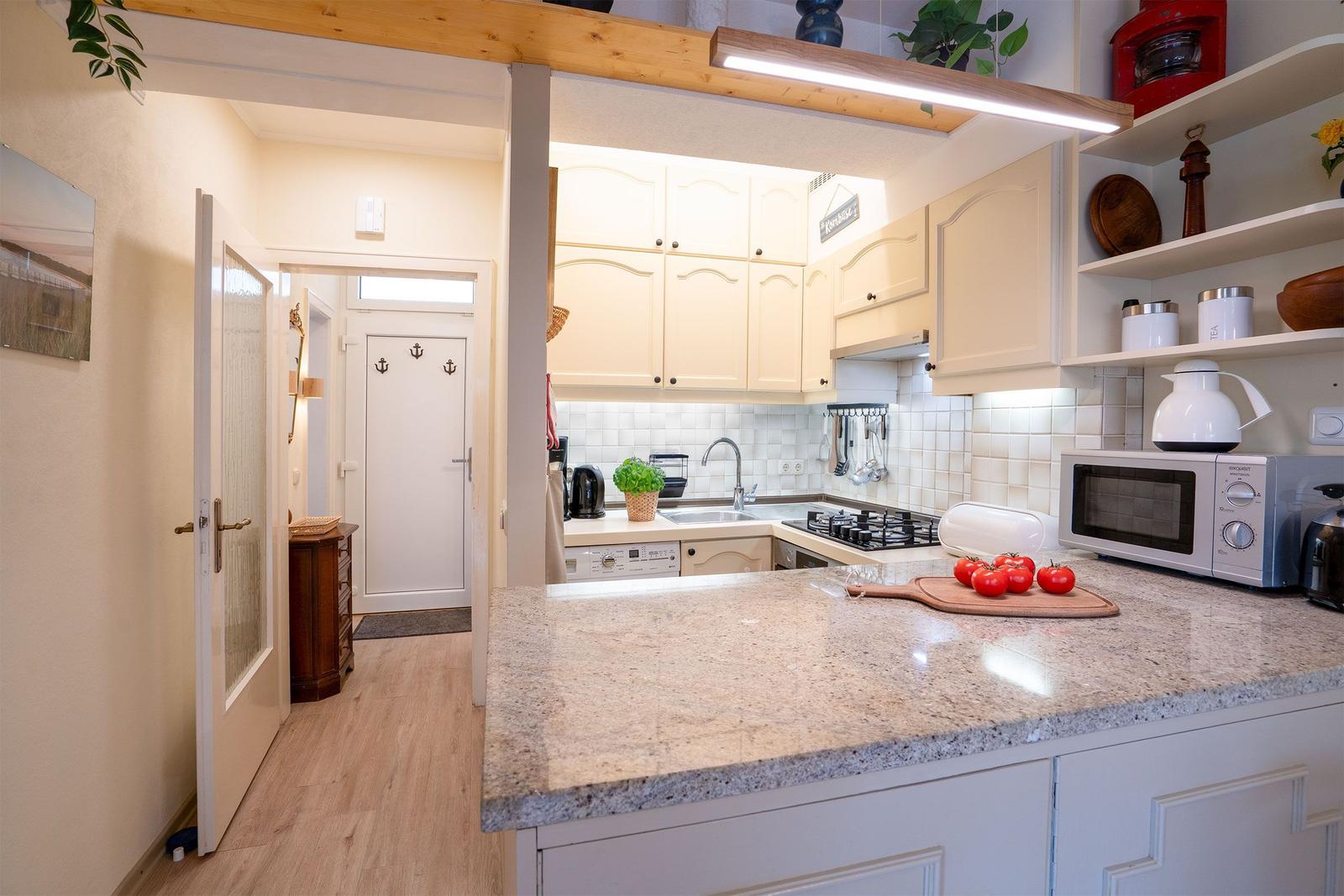 Die gut ausgestattete Küche verfügt über einen Gasherd, Elektrobackofen, Mikrowelle, Kühlschrank mit Gefrierfach sowie Kaffeemaschine, Toaster und Wasserkocher, Waschmaschine. Das Badezimmer bietet eine bodengleiche Dusche und einen Haartrockner. Entspannen Sie auf der Terrasse mit Gartenmöbeln und genießen Sie die frische Luft. Haustiere bzw. Hunde sind nicht erlaubt, PKW Stellplatz vorhanden.