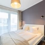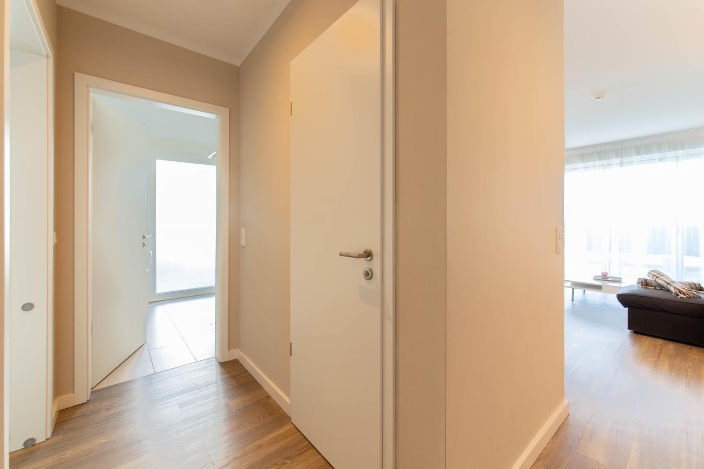 Drei Zimmer bieten Platz für bis zu sechs Personen. Beide Schlafzimmer sind mit bequemen Doppelbetten (1 x 1,80er & 1 x 1,60er Breite) ausgestattet. Außerdem gibt es im Wohnbereich eine gemültliche Schlafcouch (1,40er Breite). Die offene Küche ist komplett ausgestattet und lässt keine Wünsche offen. Eine sich über die gesamte Front öffnende Glas-Faltwand im Wohnzimmer gewährt einen unmittelbaren Meerblick und sorgt den ganzen Tag für eine helle und freundliche Atmosphäre. Ebenso ermöglicht sie einen fließenden Übergang auf die großzügige, möblierte Terrasse mit Gartenanteil, von der man ebenfalls eine traumhafte Aussicht auf das Meer genießen darf. Das moderne Badezimmer ist mit einer Dusche und einem WC ausgestattet. Außerdem gibt es noch ein separates Gäste-WC. Im Waschkeller steht eine eigene Waschmaschine für das Appartement zur Verfügung. Eine Fußbodenheizung in der ganzen Wohnung, sowie elektrische Außenrollläden runden das vielfältige Angebot ab.