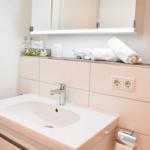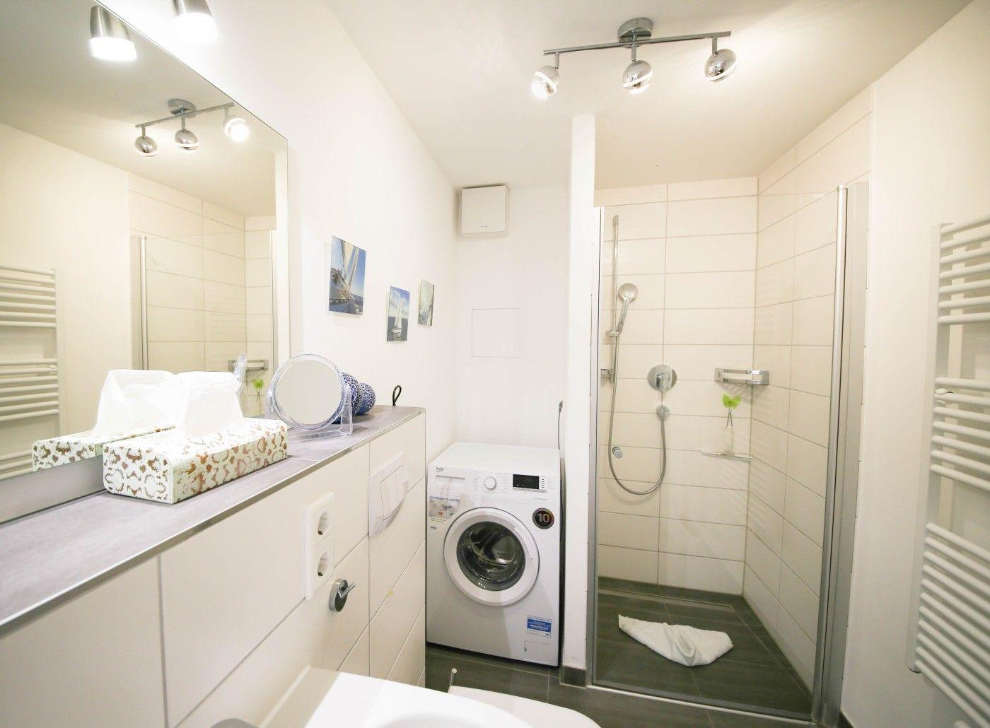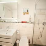 Im unteren Bereich der Wohnung befindet sich ein weiteres Badezimmer, welches dem oberen Bad in Nichts nachsteht. Zusätzlich gibt es hier eine Waschmaschine, die den Familienurlaub perfekt macht! Das zweite Schlafzimmer verfügt über ein Schrankbett, welches dank der hohen Qualität den Komfort eines normalen Bettes verspricht.