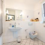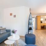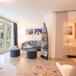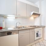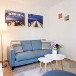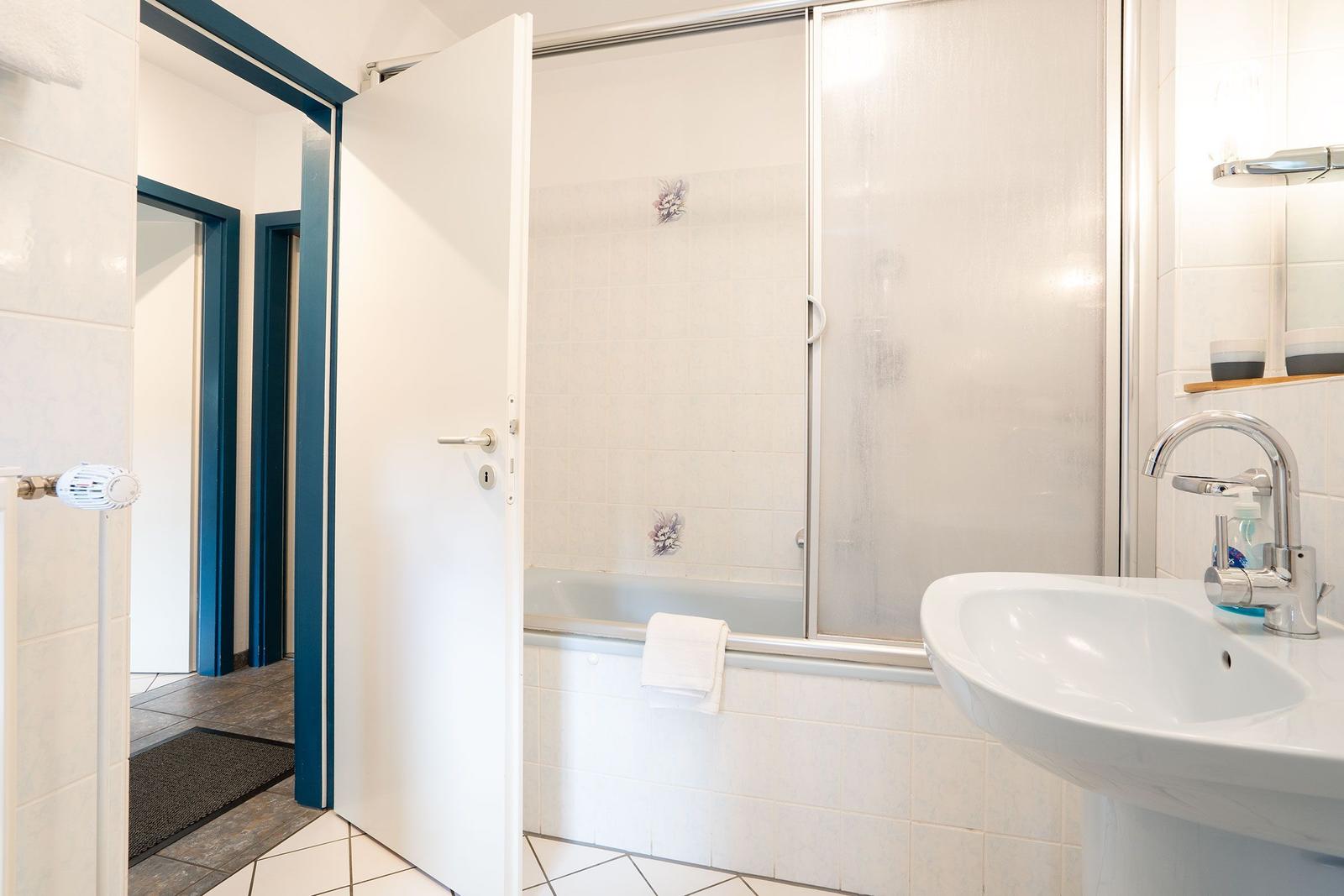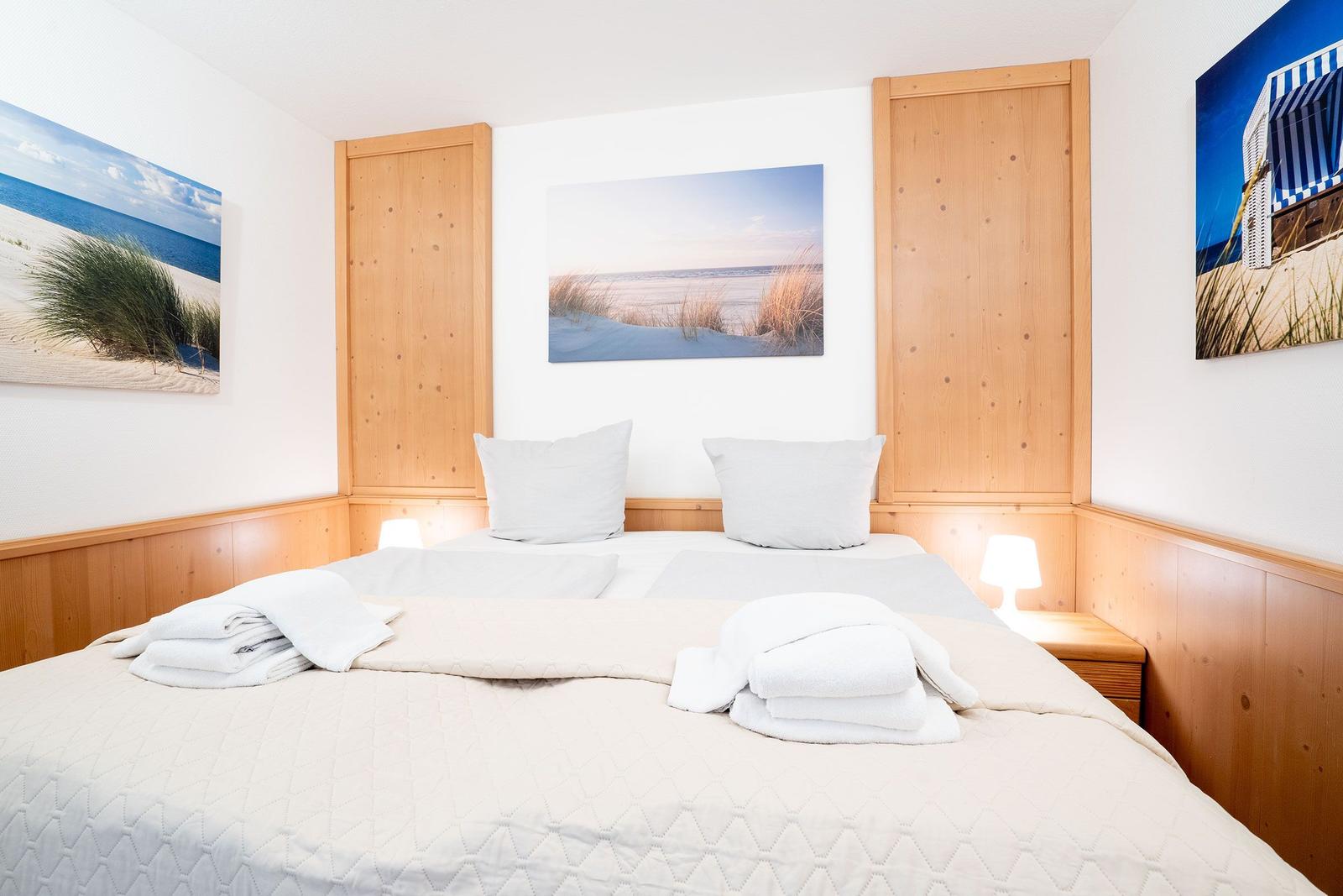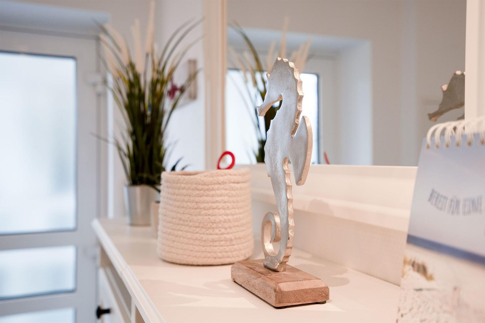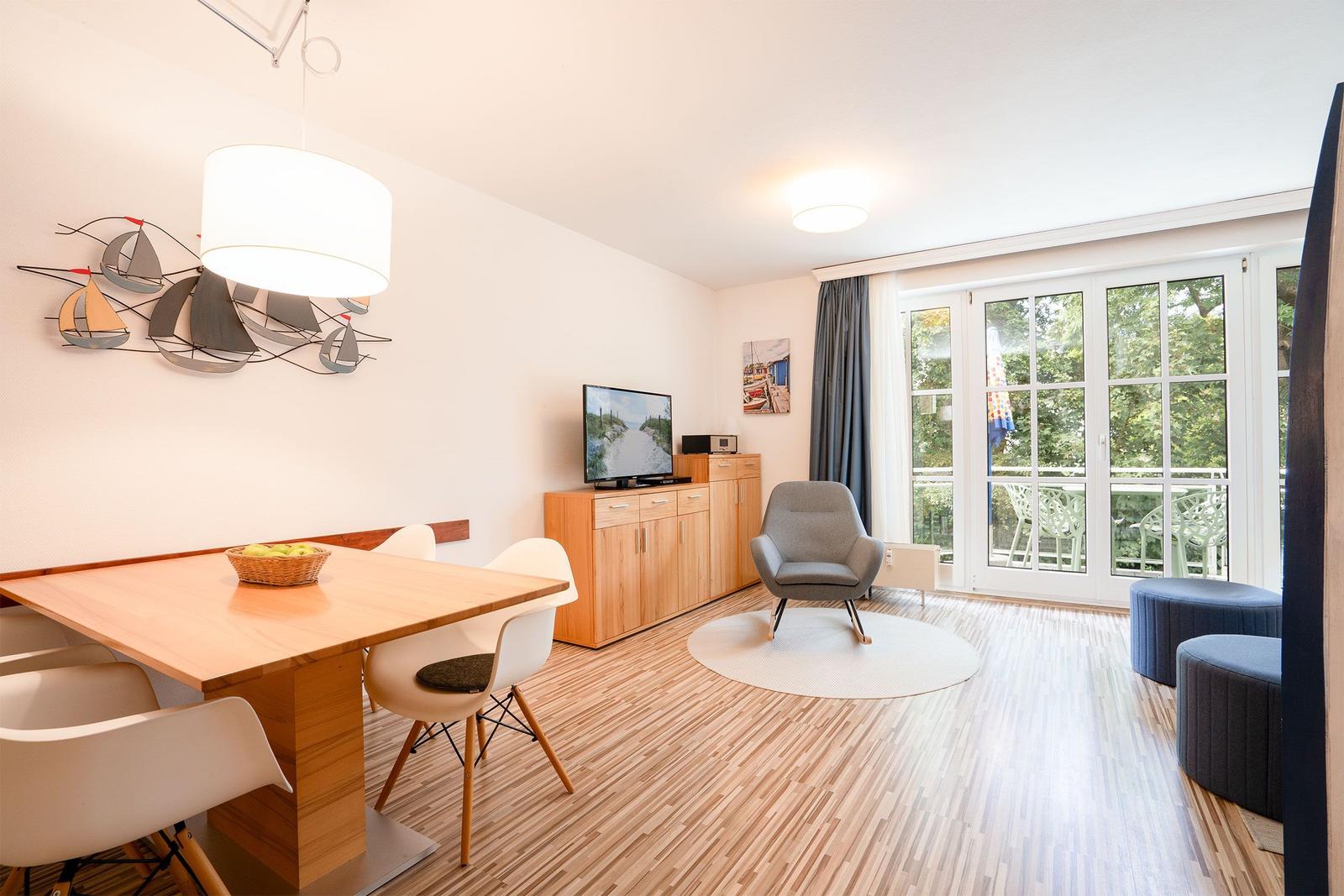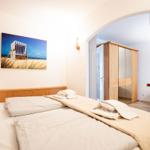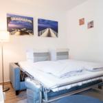 Ostseeallee 11, ca. 51 m²,1. Etage, Wohnzimmer mit Schlafcouch, großzügige Essecke, TV, WLAN, Stereoanlage mit CD und DVD-Player, Radio, Schlafzimmer mit 2 Einzelbetten (Vorhangschienen als Tür), Einbauküche mit Backofen, Geschirrspüler, Mikrowelle und Toaster, zusätzlicher Tassimo-Kaffeeautomat, 4-Platten-Herd, Kühlschrank mit Gefrierfach, Badewanne/WC, Regendusche, Haartrockner, Schuhschrank