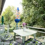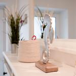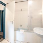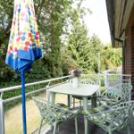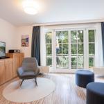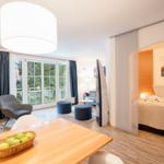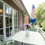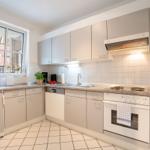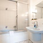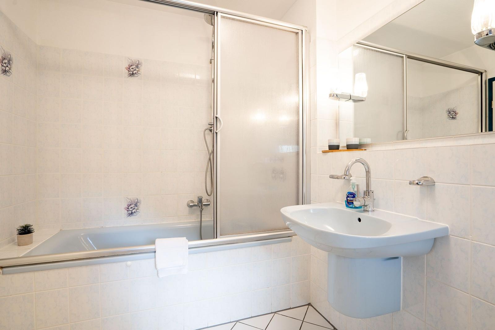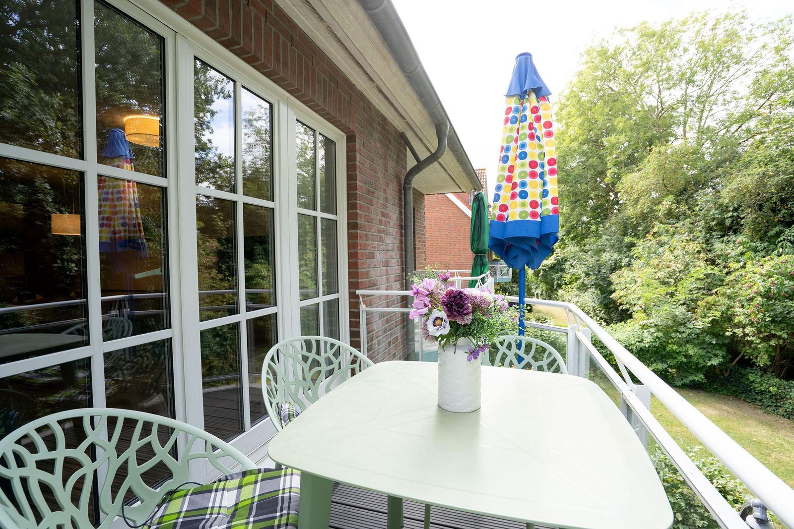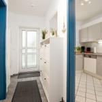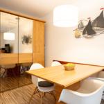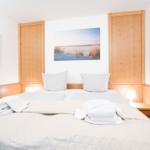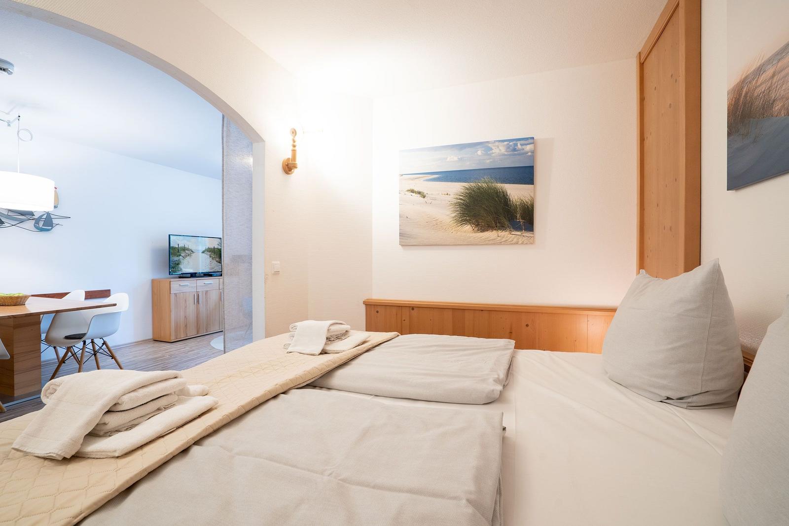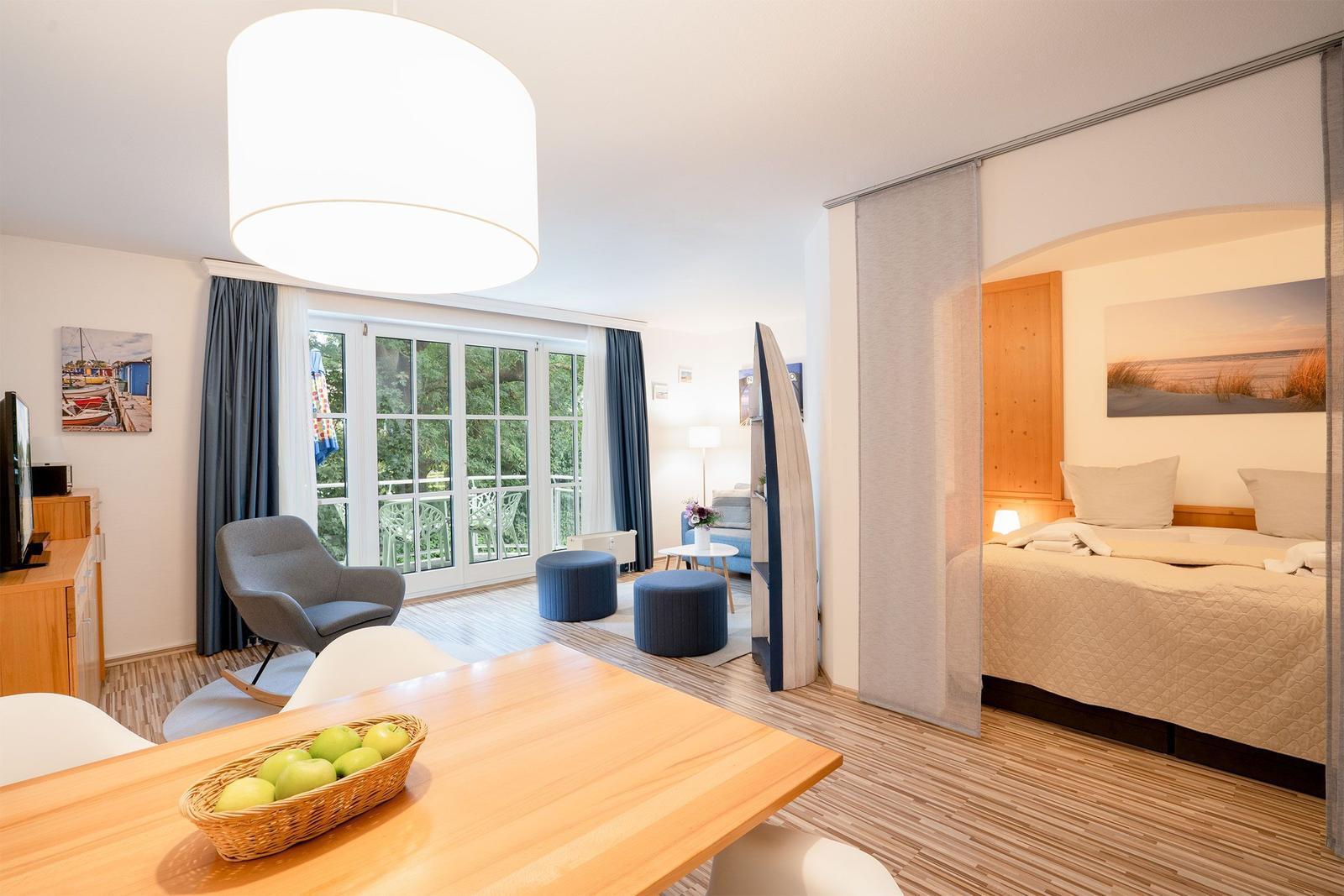 Ostseeallee 11, ca. 51 m²,1. Etage, Wohnzimmer mit Schlafcouch, großzügige Essecke, TV, WLAN, Stereoanlage mit CD und DVD-Player, Radio, Schlafzimmer mit 2 Einzelbetten (Vorhangschienen als Tür), Einbauküche mit Backofen, Geschirrspüler, Mikrowelle und Toaster, zusätzlicher Tassimo-Kaffeeautomat, 4-Platten-Herd, Kühlschrank mit Gefrierfach, Badewanne/WC, Regendusche, Haartrockner, Schuhschrank