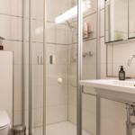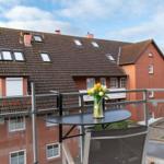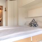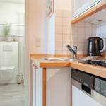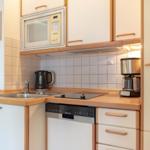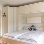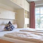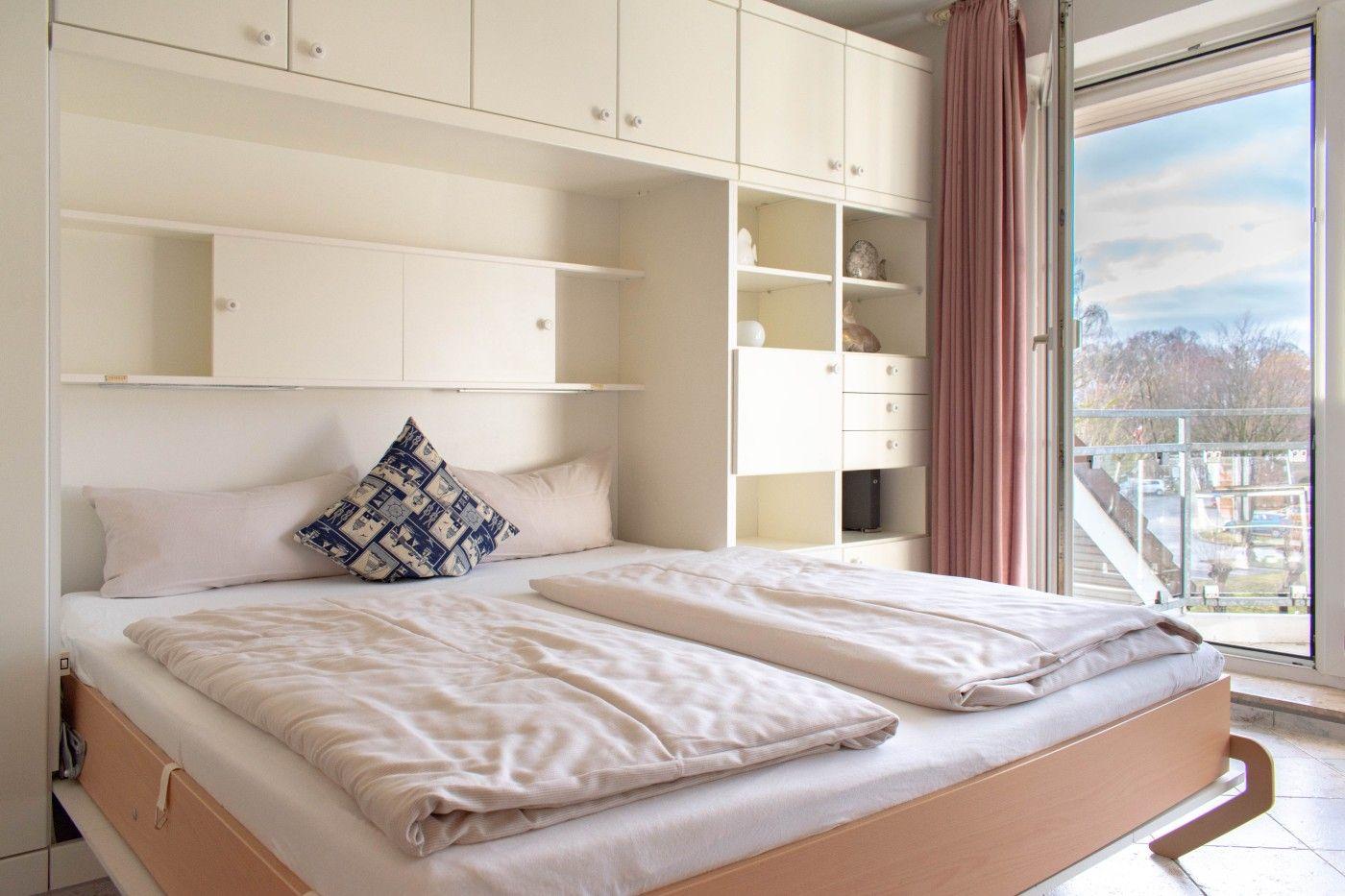 Ein Zimmer mit Doppelbett, Balkon und Küche bietet Platz für zwei Gäste. Bodentiefe Fenster im Wohnzimmer sorgen den ganzen Tag für eine helle und freundliche Atmosphäre. Als Schlafbereich dient ein bequemes Schrankbett (1,80er Breite). Dies kann tagsüber im dafür vorgesehenen Schrank verstaut werden, sodass der Wohnraum geschickt und effizient genutzt wird. Die Küche ist gut ausgestattet und lässt keine Wünsche offen. Der sonnige Balkon hat eine süd-westliche Ausrichtung und ist möbliert. Ein Sonnenschirm spendet hier an heißen Tagen den nötgen Schatten. Waschmaschine und Trockner stehen gegen Gebühr zur Verfügung. Das moderne Badezimmer verfügt über eine Dusche und ein WC.