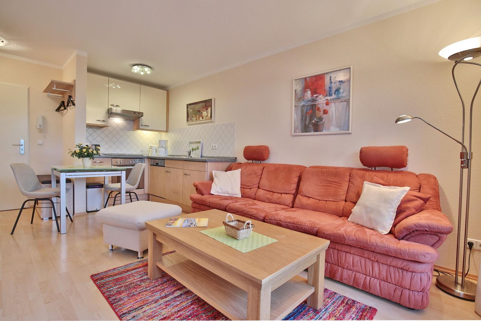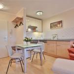 Die Ferienwohnung bietet eine moderne Ausstattung, die Komfort und Funktionalität vereint. Der offene Küchenbereich ist mit einem Elektro-/Gasherd, Backofen, Kühlschrank, Geschirrspüler sowie einer Kaffeemaschine und Espressomaschine ausgestattet, ideal für entspannte Kochabende. Ein geräumiger Esstisch lädt zum gemeinsamen Verweilen ein.