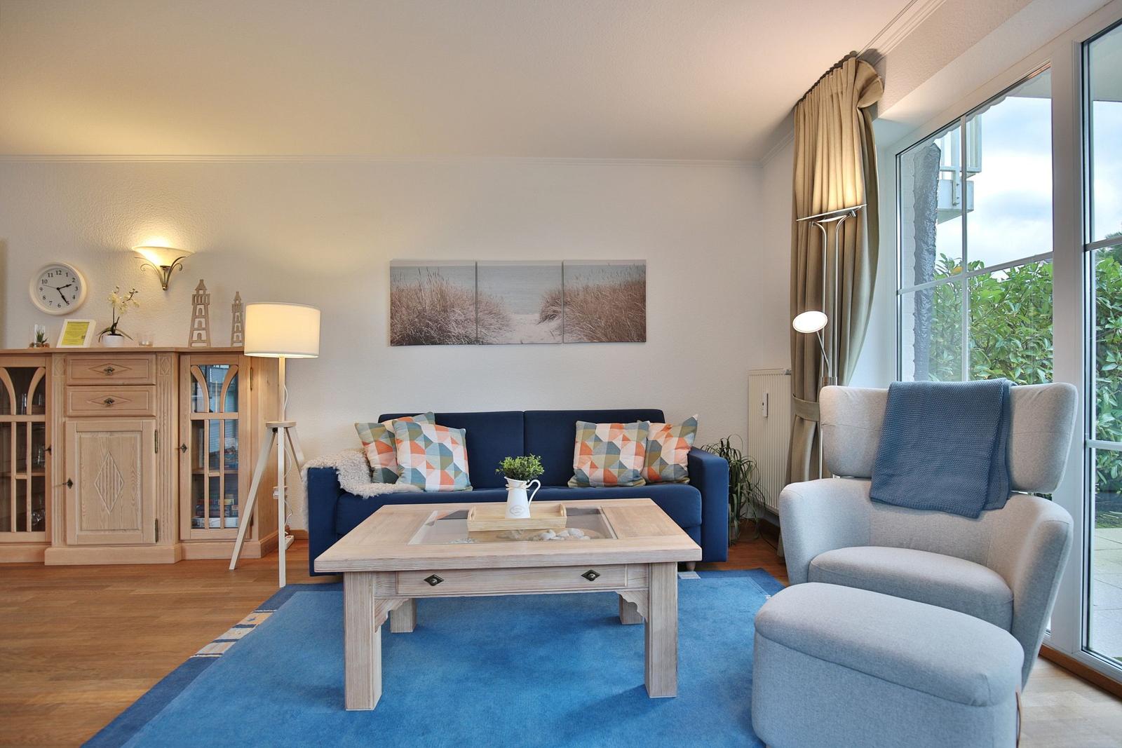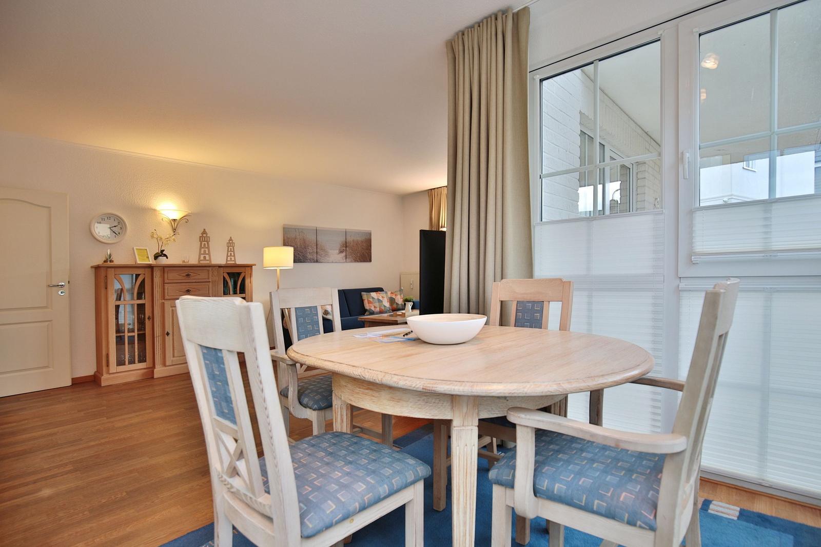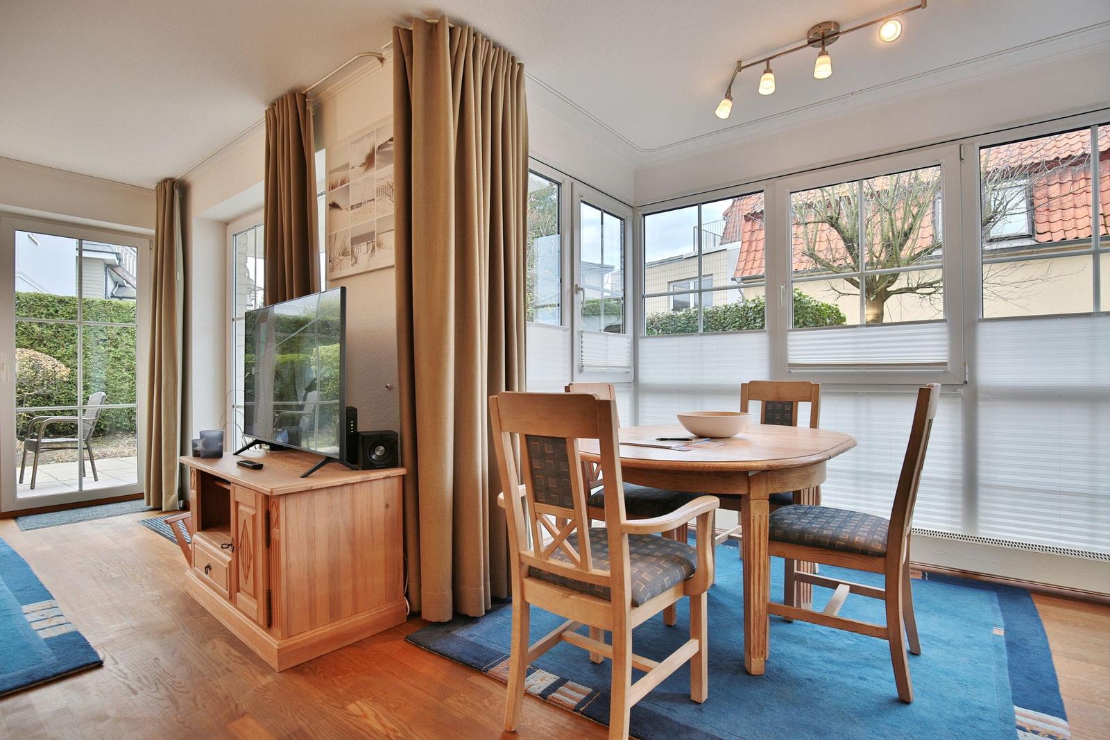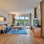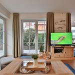 Das Haus Sonnenpark Appartement 3 in Timmendorfer Strand präsentiert sich als modernes 2-Zimmer-Appartement im Erdgeschoss mit einer Wohnfläche von 51 m², ideal für bis zu 2 Personen und ein Baby auf Anfrage. Der offene Wohnbereich verbindet Wohnzimmer und Wohnküche, ausgestattet mit Ceranherd, Backofen, Spülmaschine, Mikrowelle sowie allen notwendigen Küchenutensilien. Die hochwertige Couchgarnitur, Esstisch und Smart-TV bieten zusätzlichen Komfort. Das separate Schlafzimmer verfügt über ein Doppelbett (180x200 cm) und einen Kleiderschrank. Ein modernes Badezimmer mit Dusche, Waschbecken, WC und Fenster ergänzt die Ausstattung. Gemeinschaftliche Einrichtungen wie eine Waschmaschine, Trockner sowie ein abschließbarer Abstellraum für Fahrräder stehen im Keller zur Verfügung. Einen Tiefgaragenstellplatz gibt es ebenfalls. WLAN ist vorhanden, während Haustiere nicht gestattet sind.